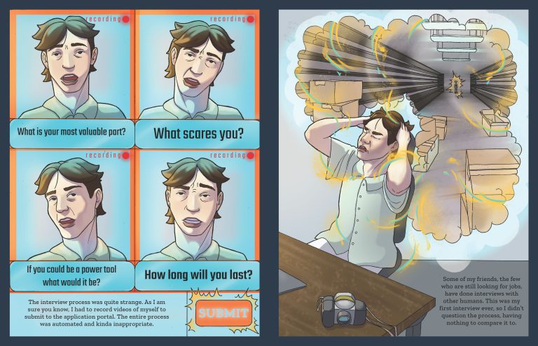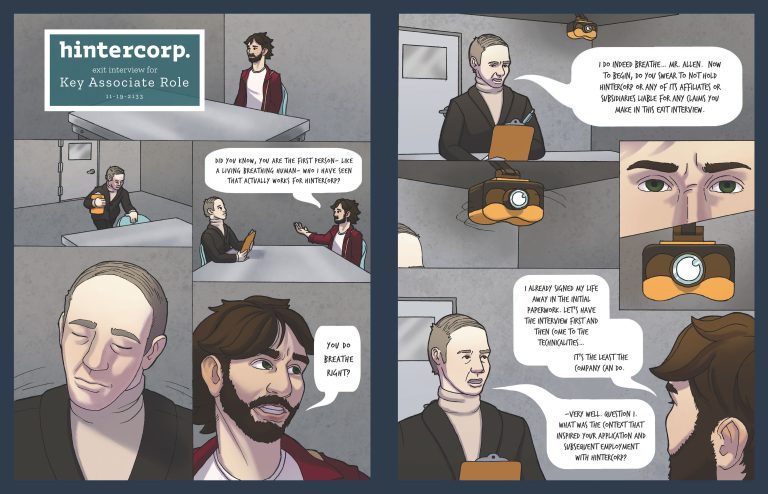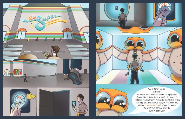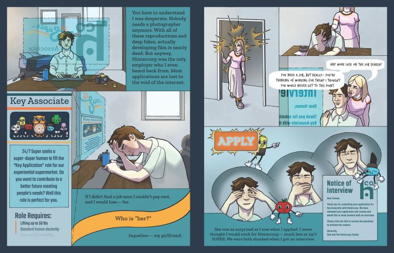 In the near future Kieran is hired at an uncanny experiential supermarket. Eventually he suspects things aren’t as cheerful or accommodating as they seem. Between unreal visions and losing his memory of life beyond work he must escape his job and find his value outside of his employment.